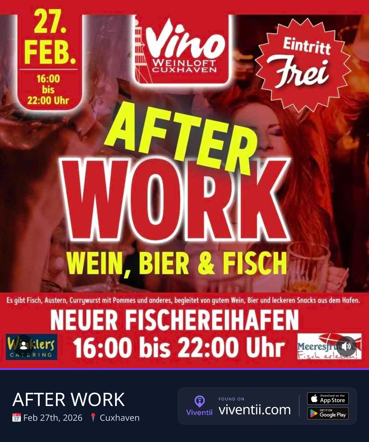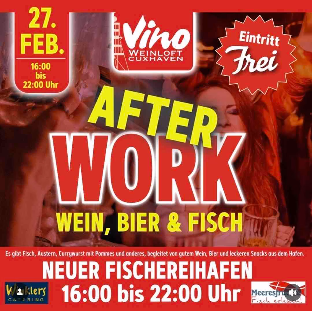 Unwind after a long day at AFTER WORK at Vino Weinloft Cuxhaven. Join us on February 27, 2026, from 4:00 PM to 10:00 PM for a relaxed evening in a great atmosphere.