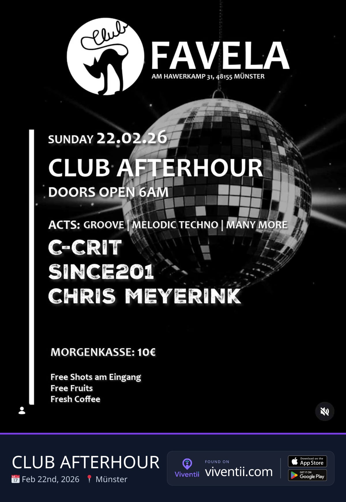 Kick off your Sunday morning at Club Favela with an exclusive CLUB AFTERHOUR session. Featuring the best in Groove and Melodic Techno, the decks will be graced by C-CRIT, SINCE201, and CHRIS MEYERINK. Start fresh with complimentary shots at the entrance, free fruits to keep you energized, and invigorating fresh coffee. Doors open at 6 AM on Sunday, February 22, 2026. Entry is just 10€ at the door. An adults-only experience for true electronic music enthusiasts.