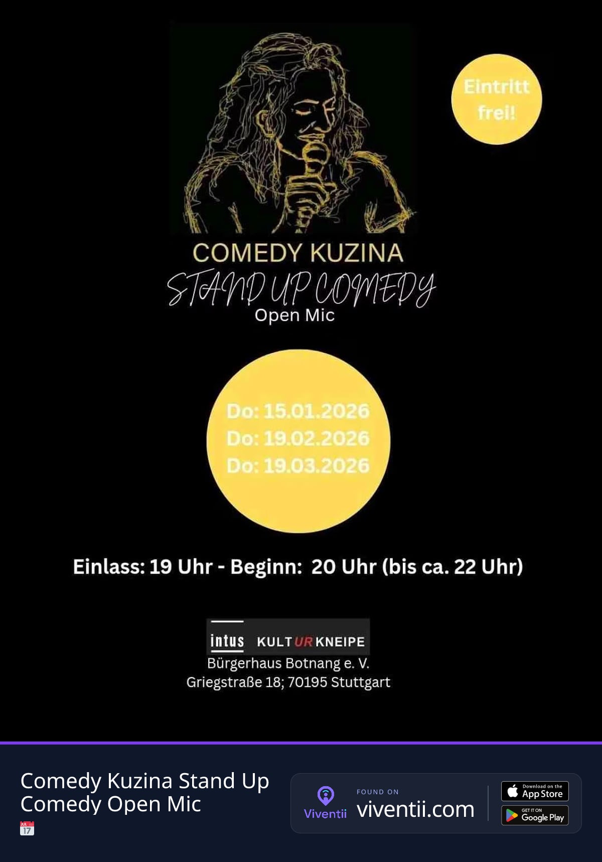 An evening of laughter awaits at intus KULTUR KNEIPE, where the Comedy Kuzina Stand Up Comedy Open Mic takes the stage. Experience a vibrant mix of emerging talents and seasoned comedians trying out new material in a relaxed and inviting atmosphere. It's the perfect opportunity to discover your next favorite comedian or simply enjoy a night of unpredictable humor. The best part? Entry is completely free! Doors open at 19:00, with the show kicking off at 20:00 until approximately 22:00. Join us on Thursday, February 19, 2026, at Bürgerhaus Botnang e. V., Griegstraße 18, 70195 Stuttgart, for a dose of spontaneous comedy.