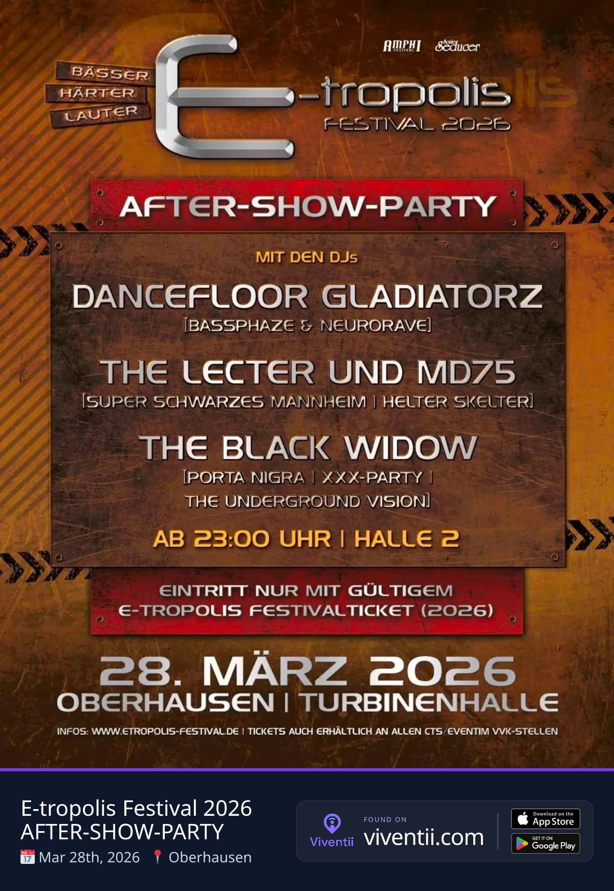 The official E-tropolis Festival 2026 After-Show-Party takes over Turbinenhalle Oberhausen, Halle 2, starting March 28, 2026, at 23:00. Experience an electrifying extension of the festival energy as the beats get *BÄSSER, HÄRTER, LAUTER* long into the night.This exclusive party is accessible only with a valid E-tropolis Festival 2026 ticket. Don't miss the ultimate festival finale in Oberhausen!The lineup promises an intense soundscape with: