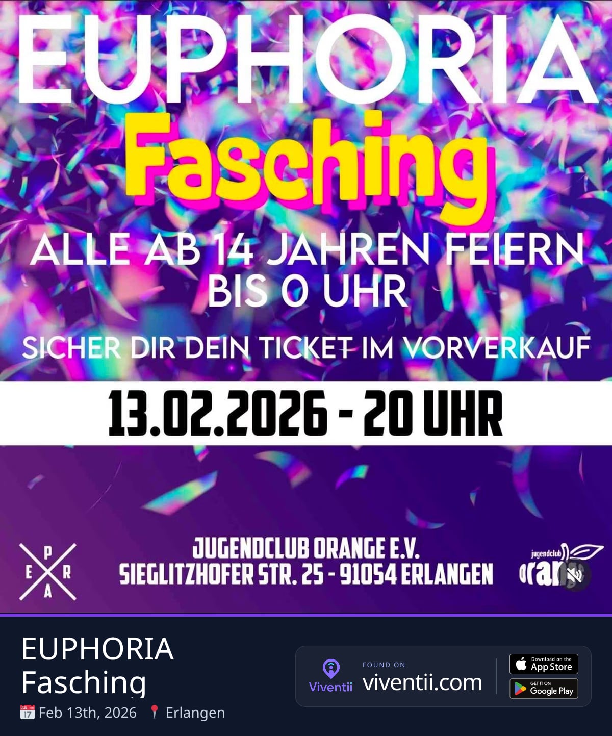 On February 13, 2026, from 8 PM to midnight, it's time to celebrate the carnival spirit. This special Fasching event is open to everyone aged 14 and above, allowing you to party until the clock strikes twelve. Join us at Sieglitzhofer Straße 25, Erlangen, Sieglitzhof, for an unforgettable evening hosted by Jugendclub Orange e.V. Secure your spot and dive into the excitement!