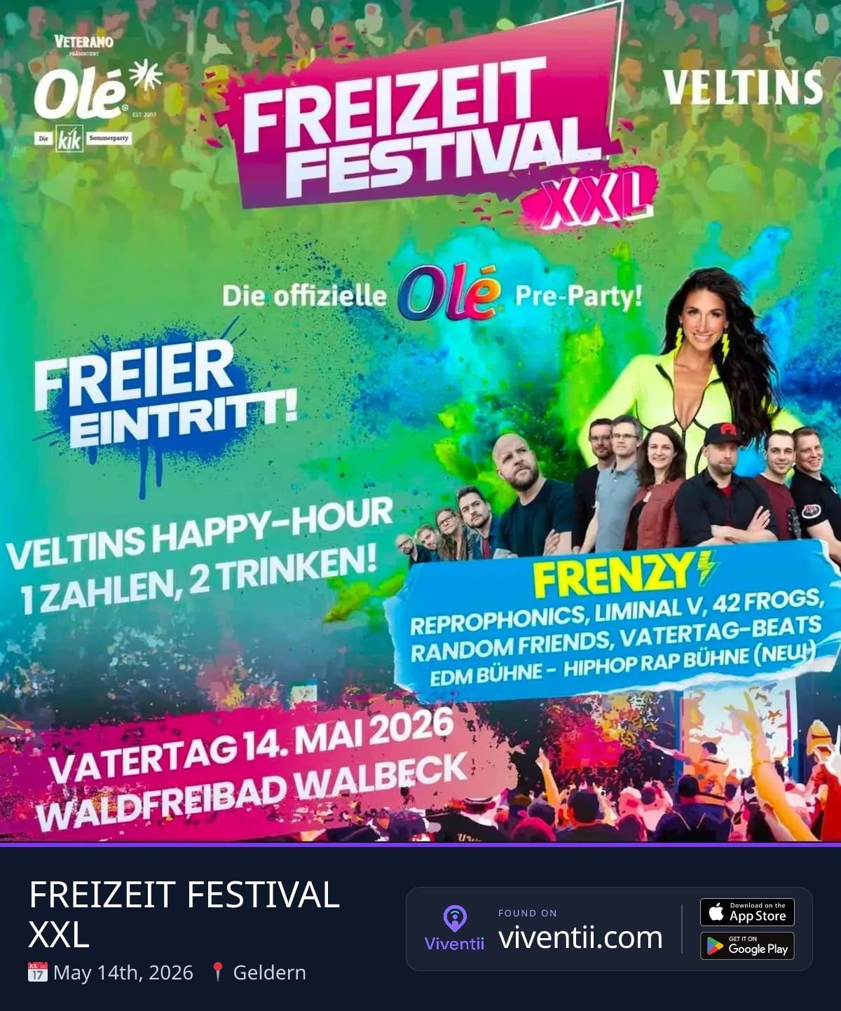 Dive into the ultimate Father's Day celebration at Freizeit Festival XXL! This grand spectacle takes place on Thursday, May 14, 2026, at the Waldfreibad Walbeck in Geldern. Get ready for the official Olé Pre-Party with free entry for everyone!