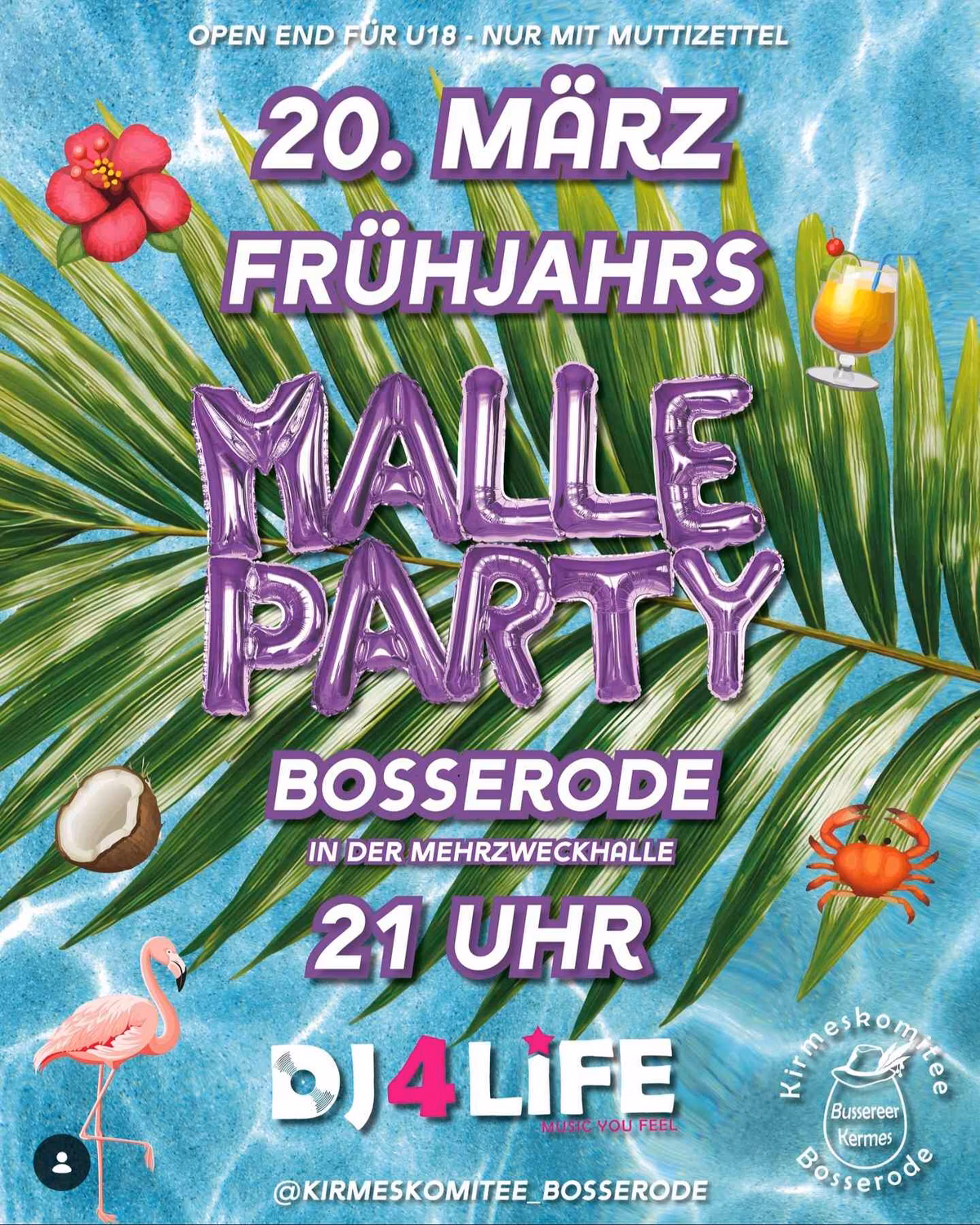 Dive into the ultimate spring break feeling right in Bosserode! The FRÜHJAHR MALLE PARTY invites you to an unforgettable night at the Mehrzweckhalle Bosserode on March 20, 2026, starting at 9:00 PM. Get ready to dance the night away to the beats of DJ 4 LIFE.