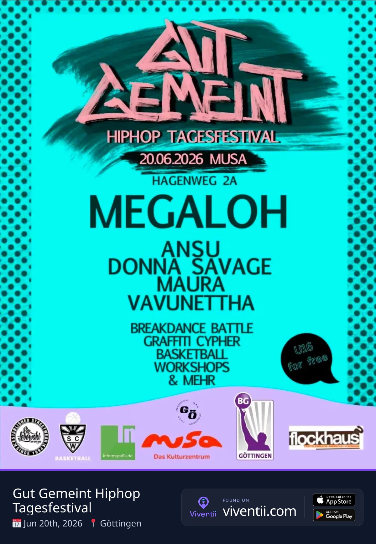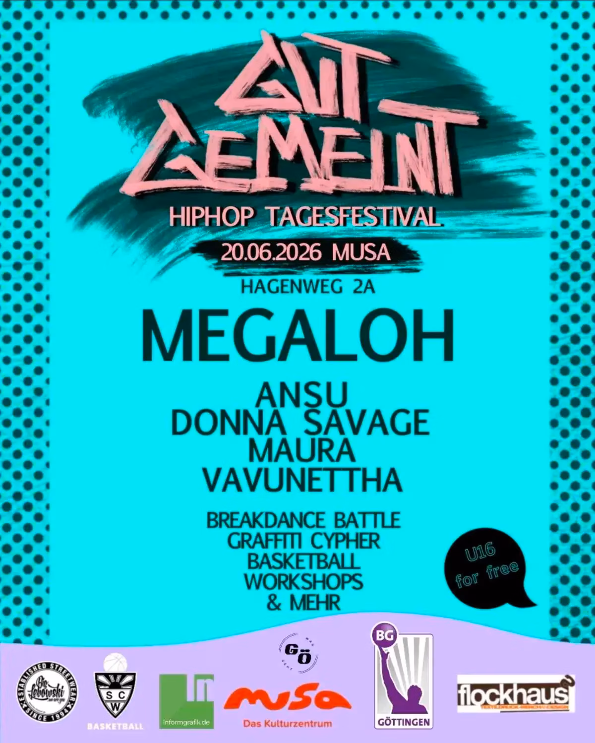 The Gut Gemeint Hiphop Tagesfestival takes over MUSA in Göttingen on June 20, 2026, kicking off at 2 PM. Prepare for an explosive day filled with the best in hip-hop, featuring an impressive lineup ready to ignite the stage.Experience electrifying performances from top artists like MEGALOH, ANSU, DONNA SAVAGE, MAURA, and VAVUNETTHA. Beyond the main stage, immerse yourself in a vibrant urban culture celebration with a dynamic breakdance battle, a creative graffiti cypher, exciting basketball action, and engaging workshops. It's a full day designed to celebrate hip-hop in all its forms.Located at Hagenweg 2a in Göttingen's Weststadt, MUSA, a renowned culture center, provides the perfect backdrop for this event. Young fans are especially welcome: entry is free for anyone under 16! Gather your crew and join us for an unforgettable day of beats, rhymes, and community.