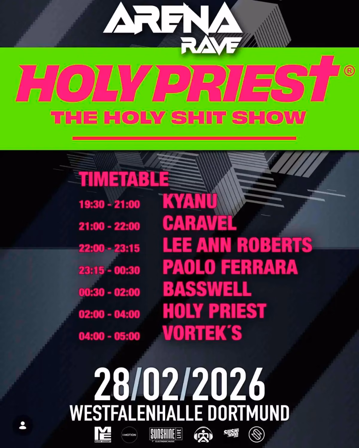 The pulsating heart of electronic music beats strong in Dortmund as Arena Rave presents HOLY PRIEST - THE HOLY SHIT SHOW. Prepare for an epic night spanning over nine hours, featuring a stellar lineup of renowned artists. From deep grooves to hard-hitting beats, the Westfalenhalle will transform into an unparalleled soundscape.