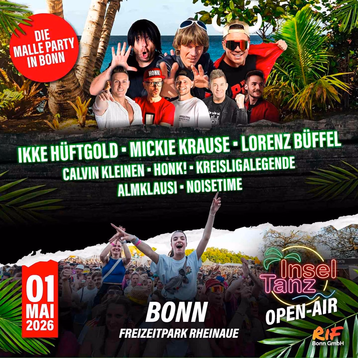 The biggest Malle party in Bonn is here! Insel Tanz OPEN-AIR transforms Freizeitpark Rheinaue into a vibrant party zone on May 1, 2026. Get ready for an unforgettable day with top Malle stars.Experience live performances from Mallorca legends like IKKE HÜFTGOLD, MICKIE KRAUSE, LORENZ BÜFFEL, CALVIN KLEINEN, HONK!, KREISLIGALEGENDE, ALMKLAUSI, and NOISETIME. This open-air spectacle promises the best party hits and an electrifying atmosphere.Don't miss the ultimate Malle feeling right in the heart of Bonn, organized by RIF Bonn GmbH. Join us for a day of non-stop music and celebration!