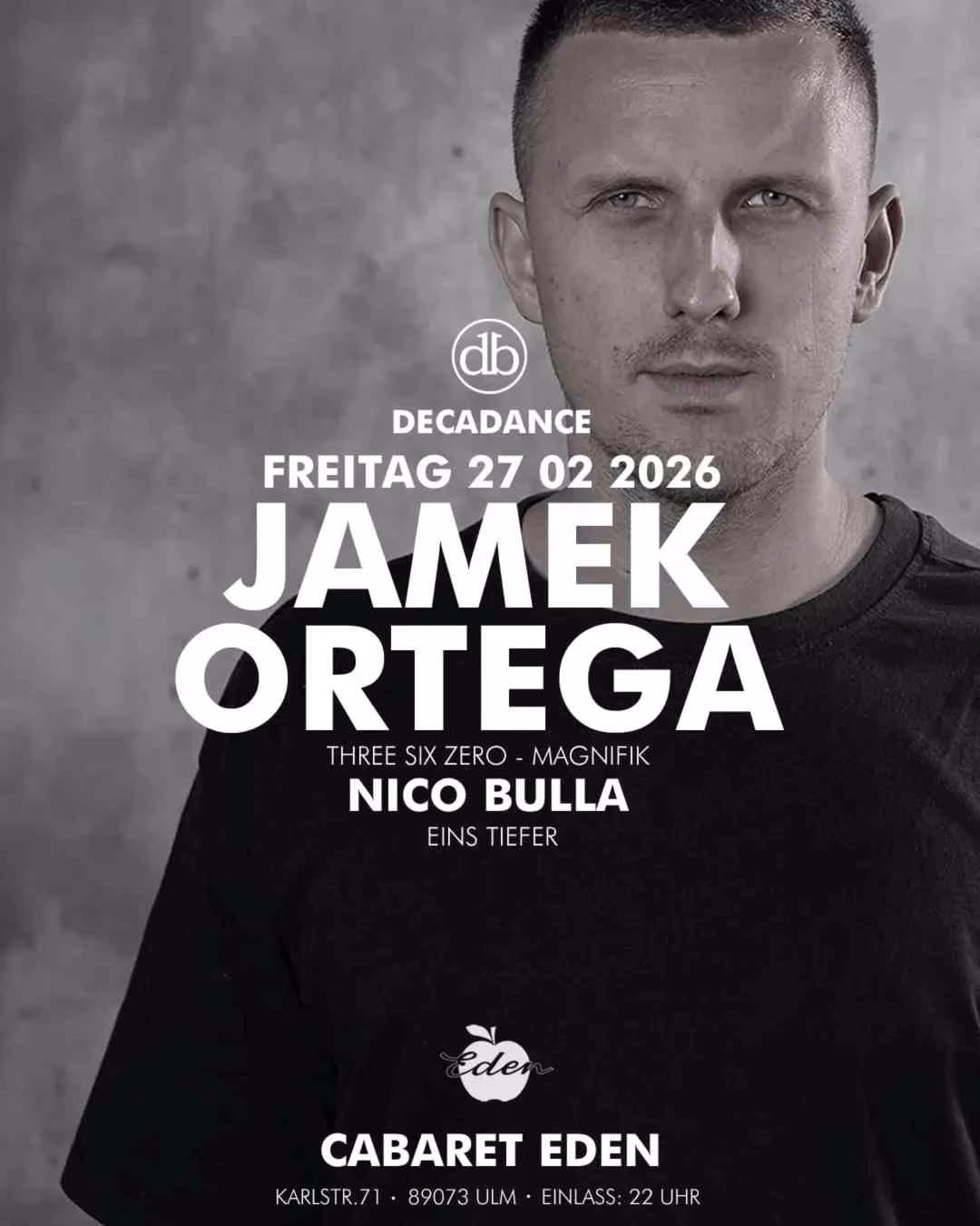 The pulse of DECADANCE electrifies Cabaret Eden on Friday, February 27, 2026, promising an unforgettable night of electronic beats. Prepare for an immersive sonic journey as headliner Jamek Ortega takes the decks, bringing his signature sound, possibly hinting at "THREE SIX ZERO - MAGNIFIK" vibes. Joining him is Nico Bulla, ready to delve "EINS TIEFER" into the depths of electronic music, ensuring the dancefloor stays vibrant. Located at Karlstr. 71 in Ulm, Cabaret Eden opens its doors at 10 PM for an adults-only party experience that will keep you moving until the early hours. Don't miss this essential date for electronic music lovers.