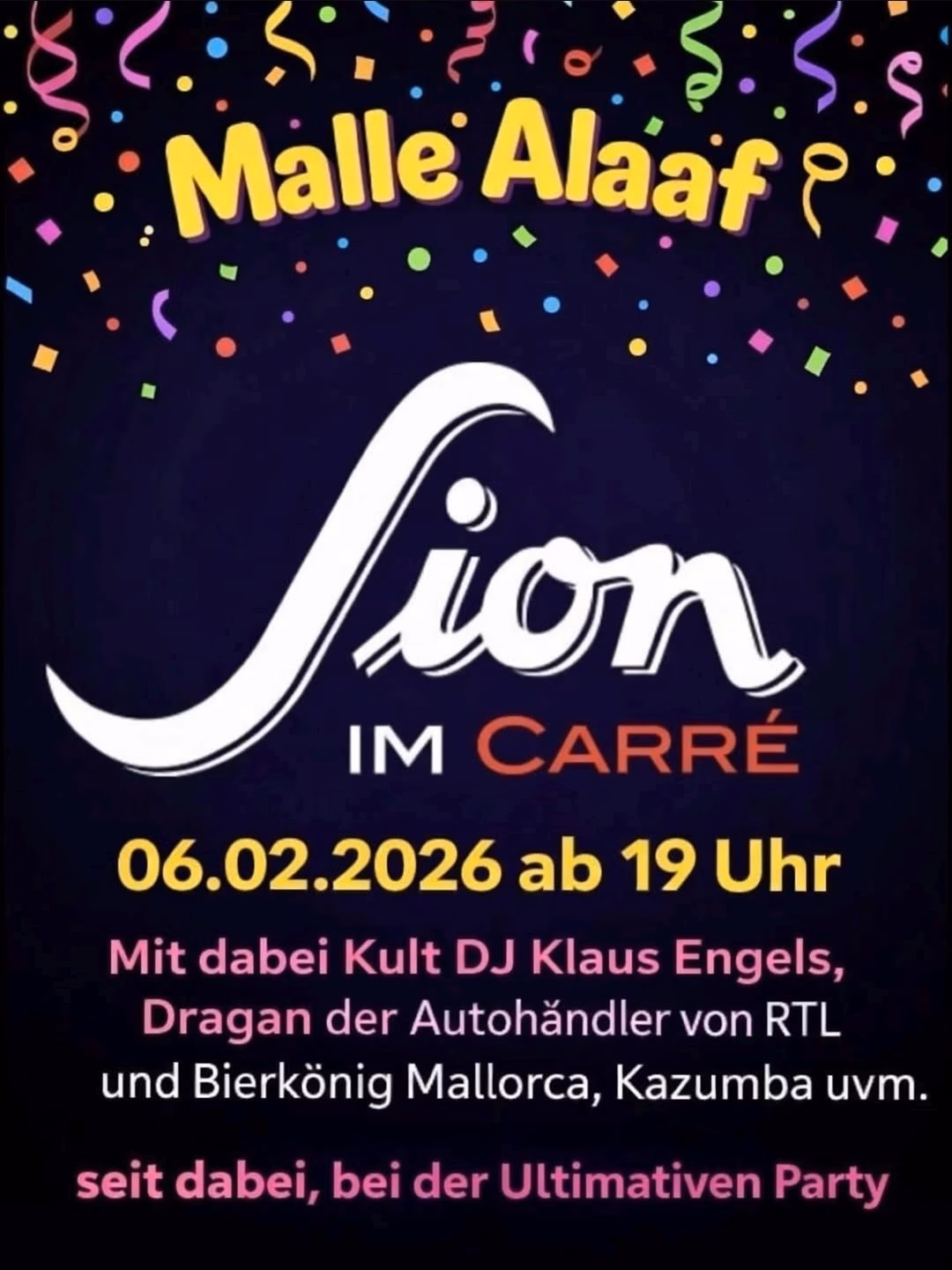 The ultimate party experience, Malle Alaaf, takes over Sion im Carré on February 6, 2026, starting at 7:00 PM. Get ready for an unforgettable night in Bonn's Altstadt-Nord, where the energy will be electrifying. This spectacular event features an incredible lineup designed to keep you dancing until dawn. Join us as Kult DJ Klaus Engels, Dragan der Autohändler von RTL, and Bierkönig Mallorca, along with Kazumba and many more, deliver non-stop hits and an unparalleled atmosphere. Don't miss out on this epic celebration at In der Sürst 1.