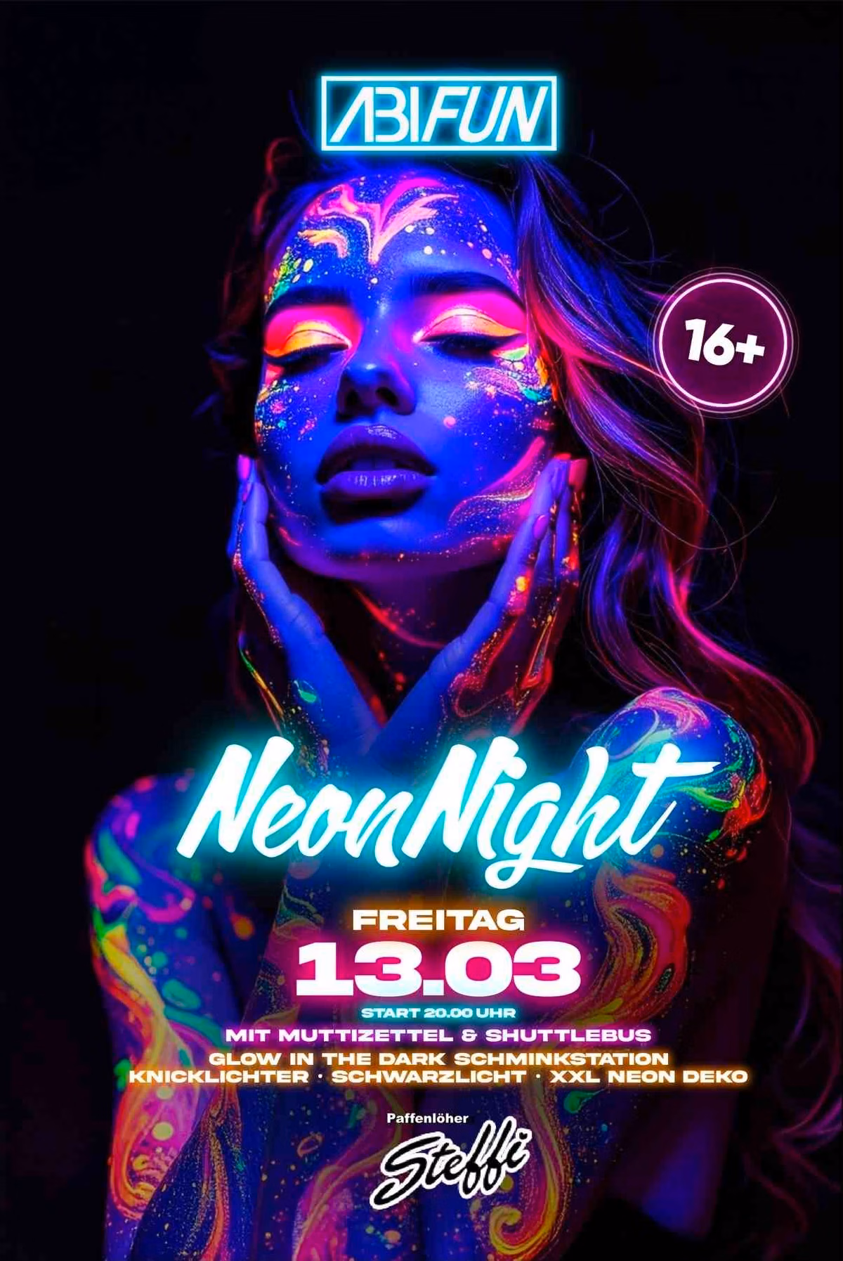 Step into a world of luminous energy at Neon Night! On Friday, March 13, 2026, starting at 8:00 PM, Paffenlöher Steffi in Wermelskirchen transforms into an unforgettable glow-in-the-dark experience for everyone 16+.