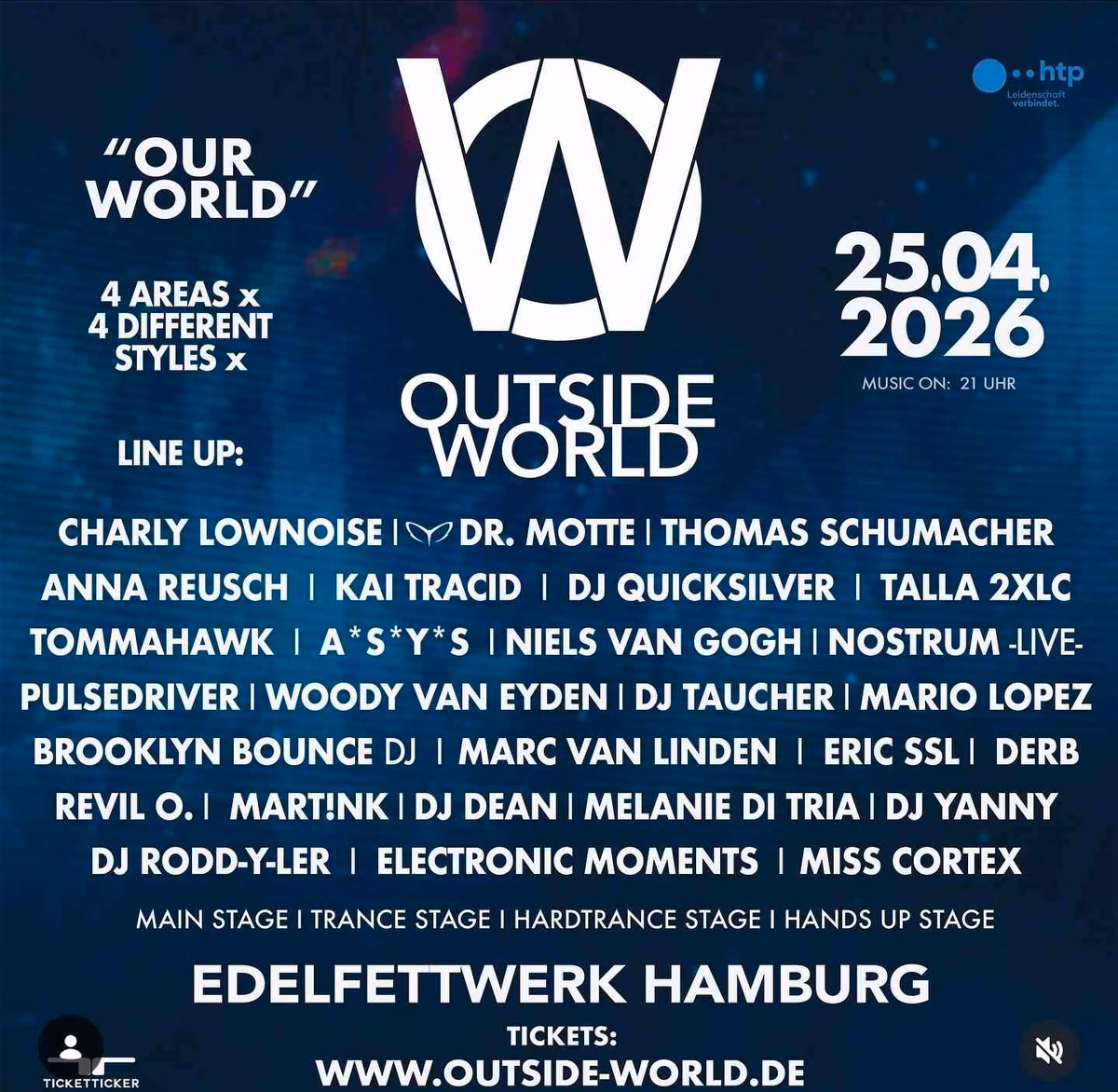 Get ready for Outside World, the ultimate party experience at Edelfettwerk Hamburg on April 25, 2026, starting at 21:00. Immerse yourself in four distinct areas featuring four different styles of electronic music.