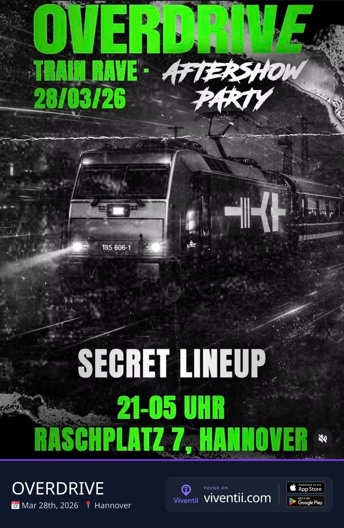 The ultimate OVERDRIVE Aftershow Party is coming to Hannover! Following the epic Train Rave, dive deep into the night at Raschplatz 7 on March 28, 2026. This adults-only event promises an electrifying atmosphere from 21:00 until 05:00.