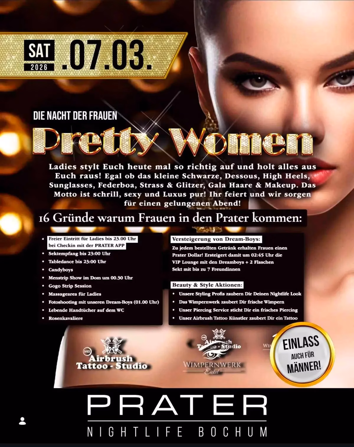 Prater Nightlife Bochum invites you to an unparalleled celebration of femininity at "Pretty Women - Die Nacht der Frauen" on Saturday, March 7, 2026. Ladies, it's time to unleash your inner glamour! Dress to impress in your little black dress, chic lingerie, high heels, sunglasses, feather boas, rhinestones, glitter, and perfect gala hair & makeup. The motto is all about being shrill, sexy, and pure luxury! We'll ensure an unforgettable evening designed just for you, featuring 16 exciting reasons to celebrate: