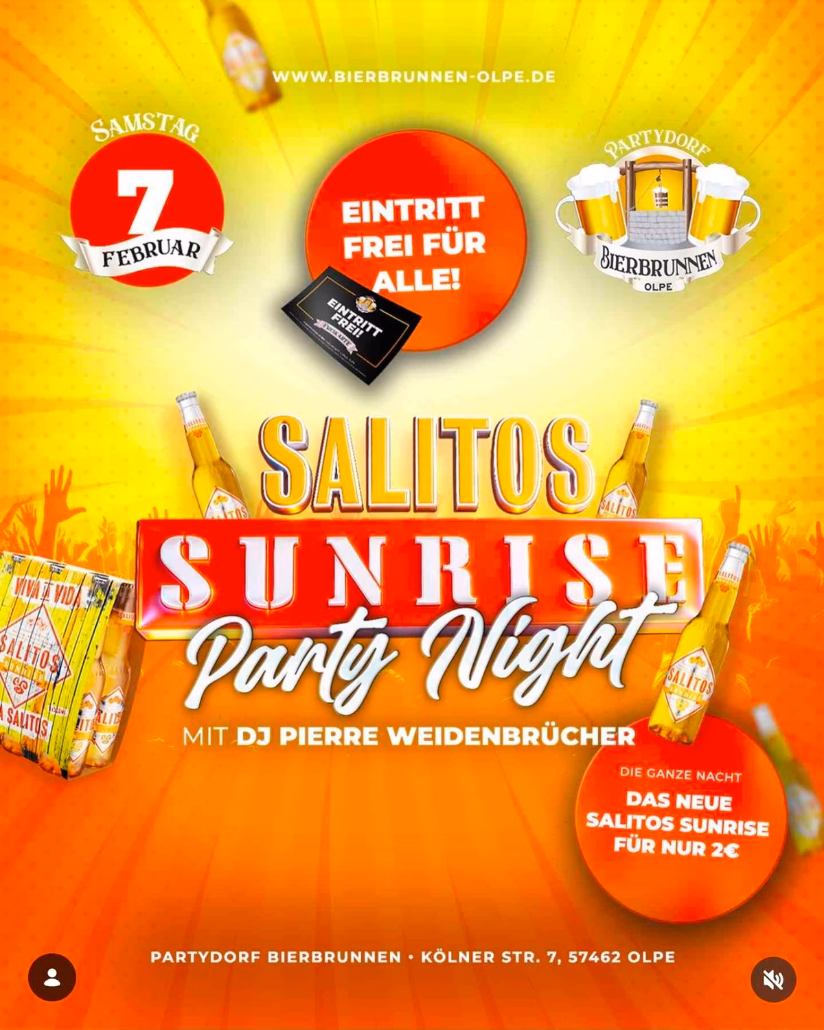 Get ready for an electrifying night as Partydorf Bierbrunnen presents the Salitos Sunrise Party Night! On Saturday, February 7, 2026, dive into a vibrant atmosphere with free entry for everyone. Dance the night away to the pumping beats of DJ Pierre Weidenbrücher, who will ensure the dance floor stays hot.