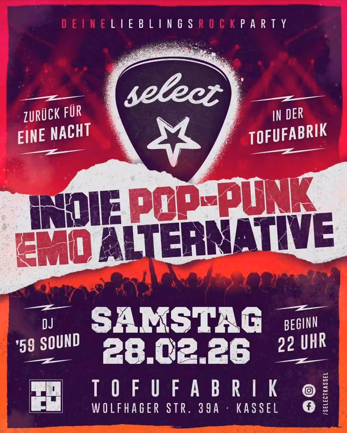 The legendary DEINE LIEBLINGS ROCK PARTY returns for an unforgettable night at Tofufabrik in Kassel. Get ready to dive into the vibrant sounds of Indie Pop-Punk, Emo, and Alternative music. DJ '59 SOUND will be spinning the best tracks to keep you dancing until the early hours. This is your chance to relive the energy and passion of your favorite rock anthems, back for just one night. Join us on Saturday, February 28, 2026, starting at 22:00 at Tofufabrik, located at Wolfhager Str. 39A, Kassel Mitte. Don't miss this electrifying rock extravaganza!