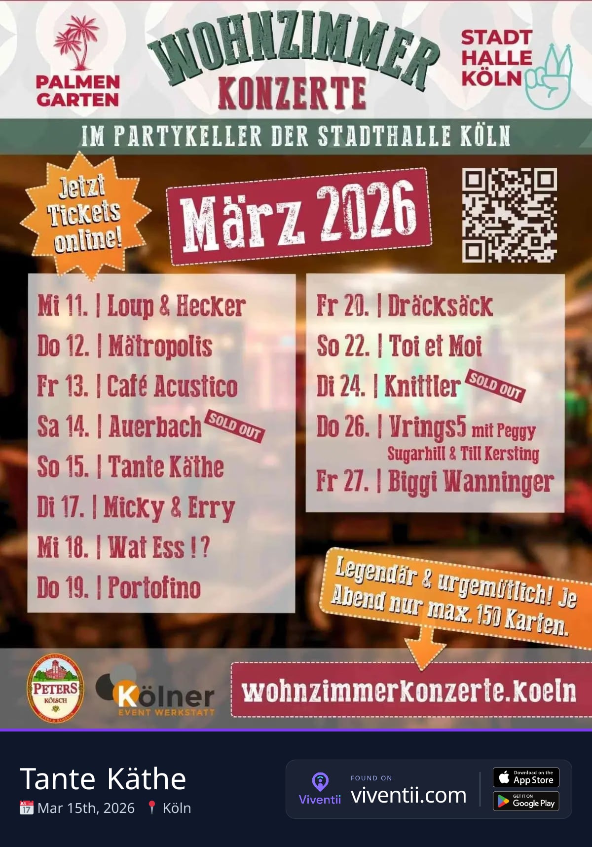 Get ready for an energetic performance by Tante Käthe at Stadthalle Köln on March 15, 2026! As part of the Wohnzimmer Konzerte März 2026, this event promises a lively atmosphere and unforgettable tunes in the heart of Cologne.