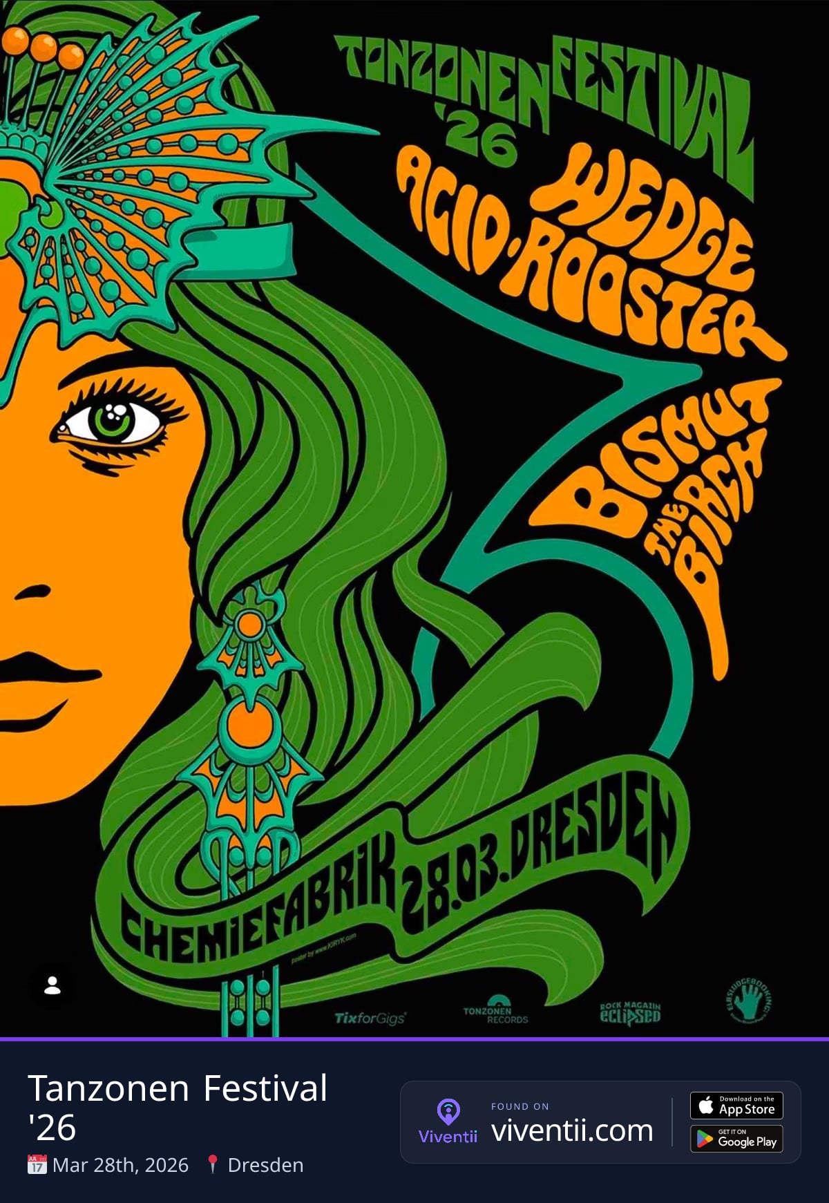 Dive into the immersive world of the Tanzonen Festival '26! Experience an unforgettable night of heavy psych and stoner rock at Chemiefabrik Dresden on March 28, 2026. Tonzonen Records presents an electrifying lineup featuring the powerful sounds of WEDGE, the raw energy of ACID ROOSTER, and the captivating grooves of BISMUT THE BIRCH. Get ready for a night of crushing riffs and hypnotic rhythms that will transport you. Secure your tickets via TixforGigs and join fellow music lovers for this essential event.