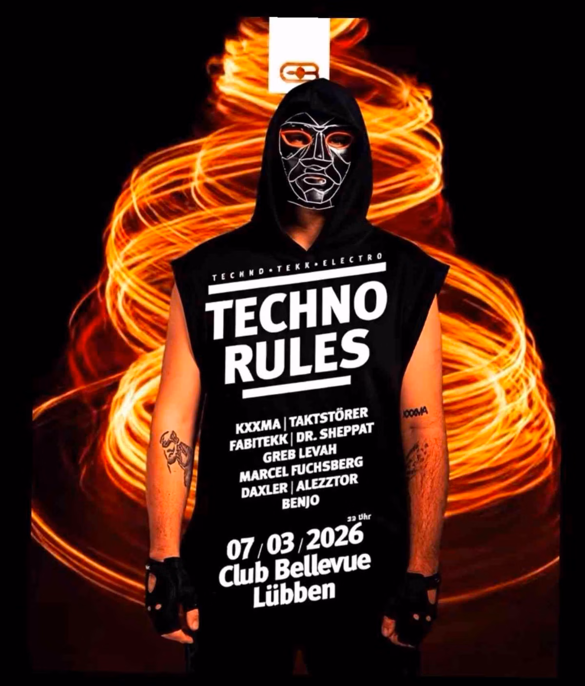 Prepare for an electrifying night as TECHNO RULES takes over Club Bellevue in Lübben! On March 7, 2026, starting at 22:00, immerse yourself in the driving beats of techno, tekk, and electro. This 18+ event promises an unforgettable experience for all electronic music enthusiasts.