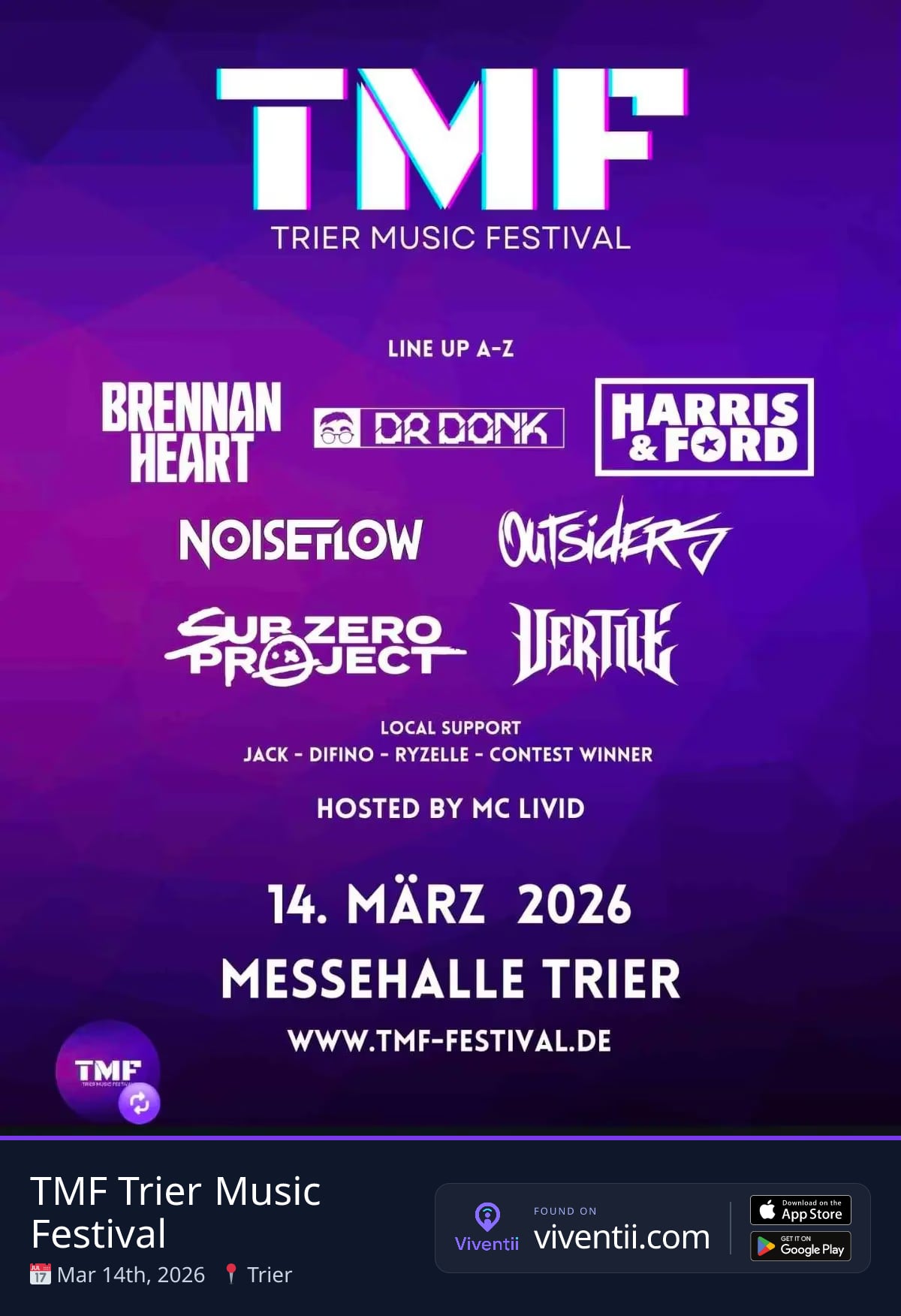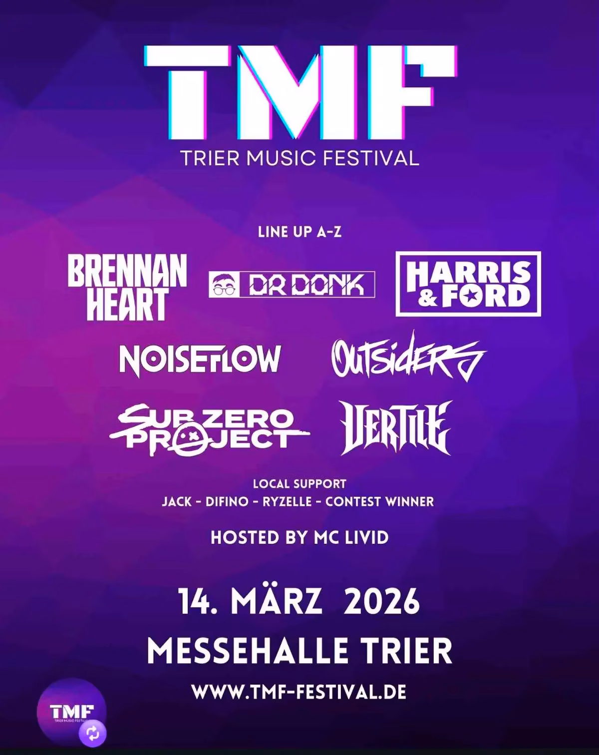 The TMF Trier Music Festival is set to ignite Messehalle Trier on March 14, 2026, delivering an electrifying night of music. Get ready for an unparalleled lineup featuring heavyweights like Brennan Heart, Dr Donk, Harris & Ford, Noiseflow, Outsiders, Sub Zero Project, and Vertile, promising an unforgettable experience for all electronic music enthusiasts.