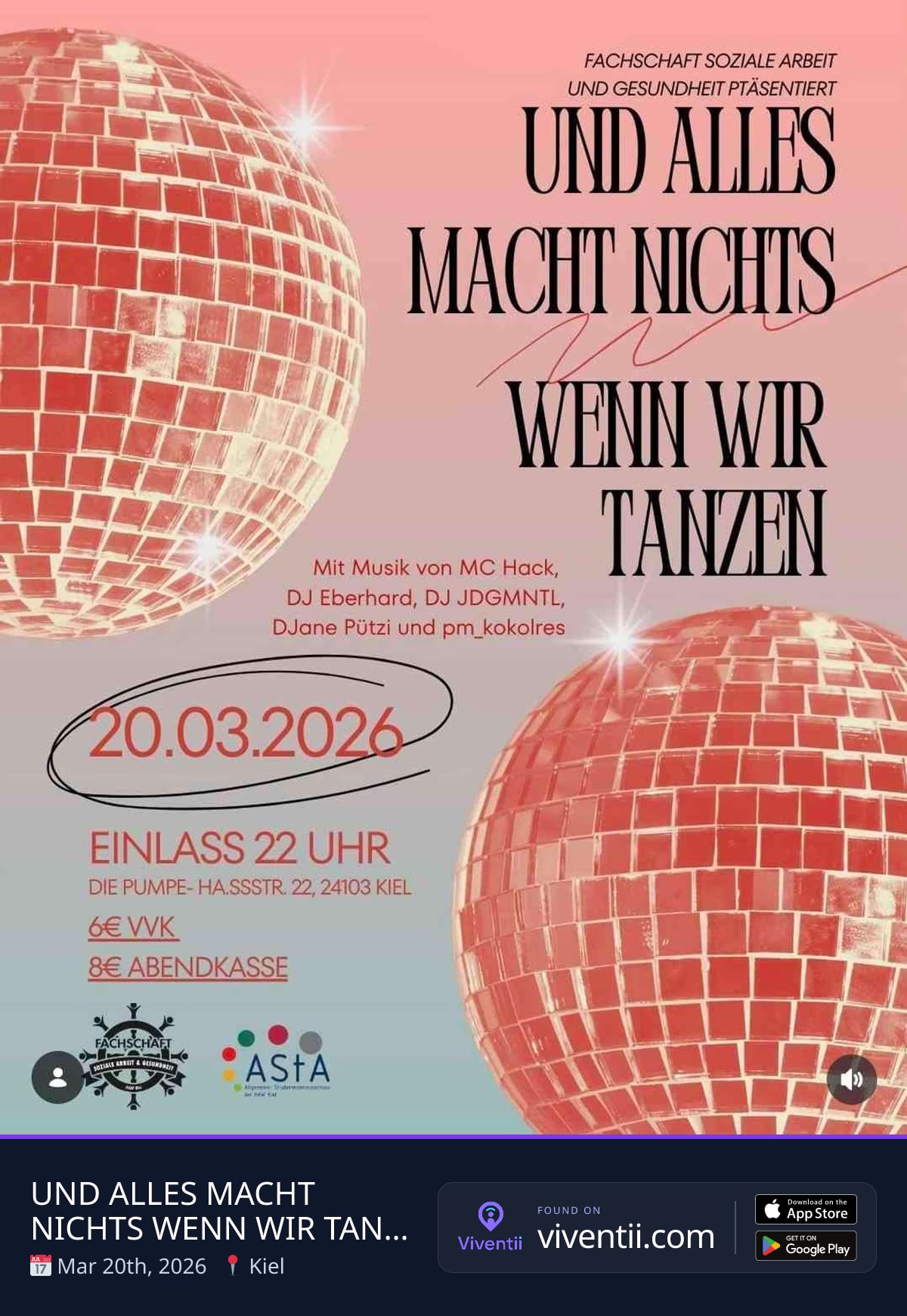 The night comes alive with UND ALLES MACHT NICHTS WENN WIR TANZEN! On March 20, 2026, starting at 22:00, Die Pumpe in Kiel transforms into the ultimate party hotspot. Organized by Fachschaft Soziale Arbeit und Gesundheit, this event promises an unforgettable evening with a stellar lineup. Immerse yourself in the electrifying beats of MC Hack, DJ Eberhard, DJ JDGMNTL, DJane Pützi, and pm_kokolres. This is the party for adults looking to let loose and move to the rhythm. Join us at Haßstr. 22, Kiel, Exerzierplatz. Tickets are available for 6€ in pre-sale and 8€ at the door.