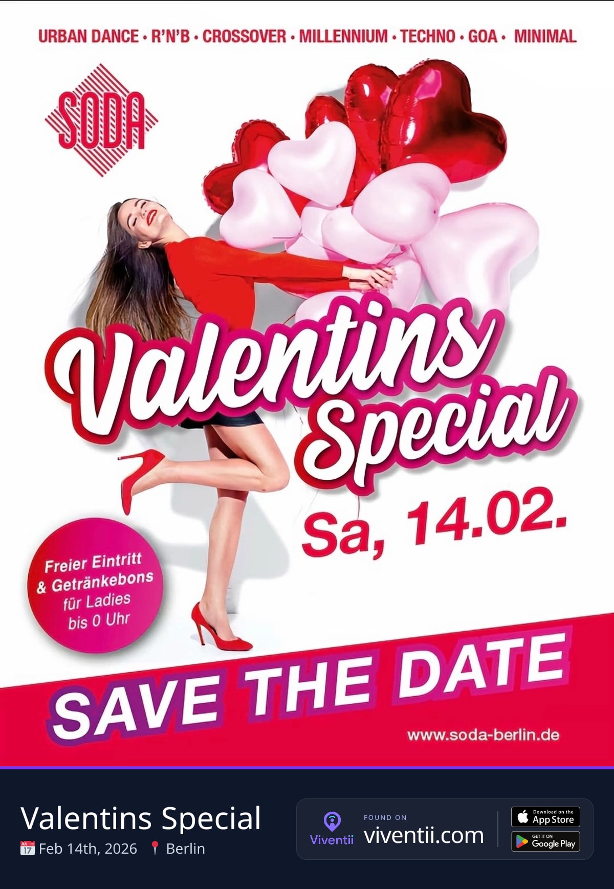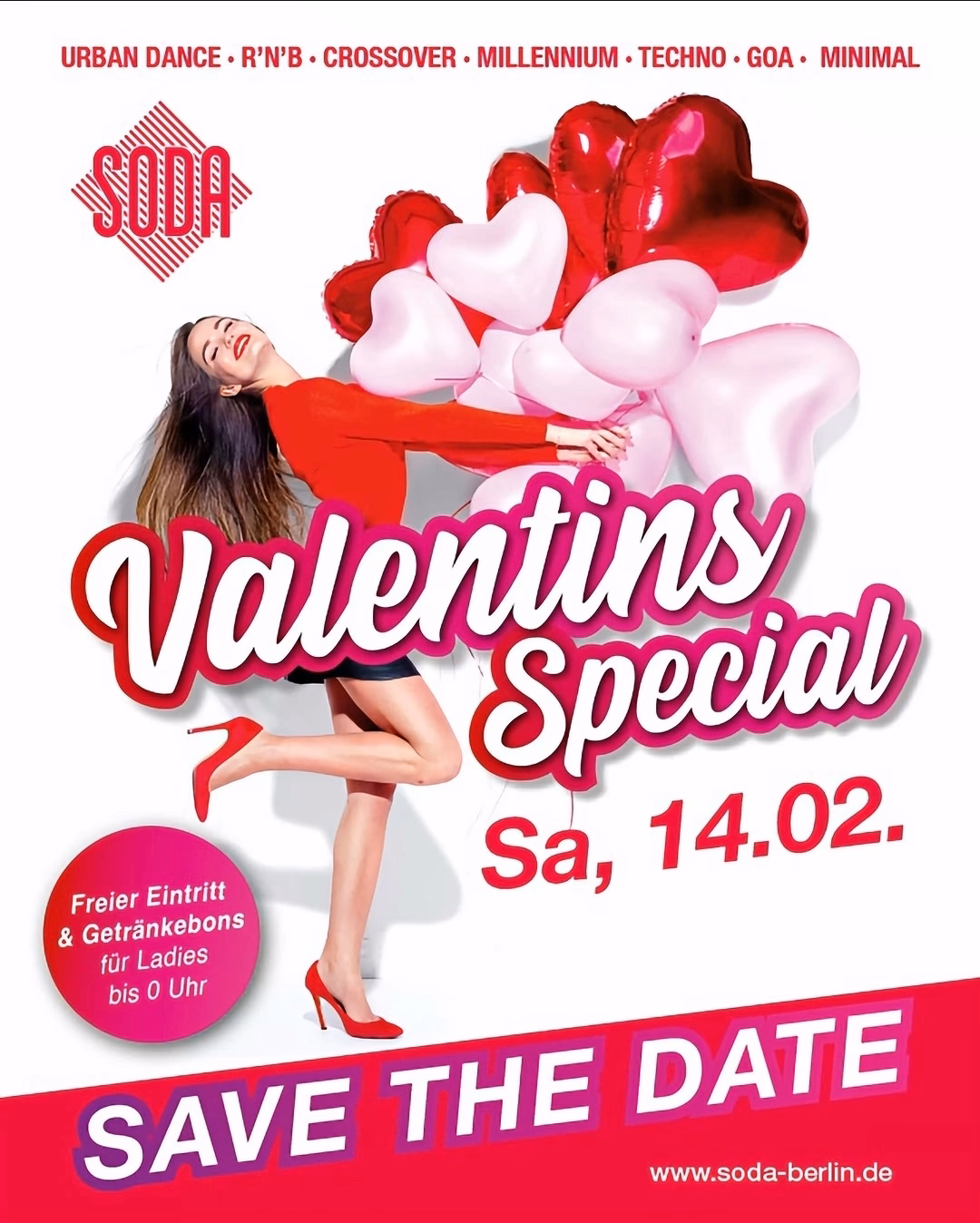 Join us on February 14, 2026, at SODA Club Berlin for a night of romance, rhythm, and revelry. Don't miss out on the ultimate Valentine's party experience. See you on the dancefloor!