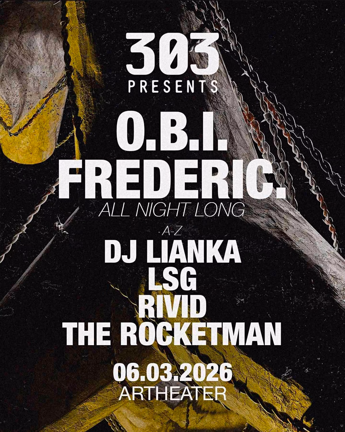 The legendary 303 Presents returns to Artheater Köln for an unforgettable night on March 6, 2026. Brace yourself for an intense all-night-long set from techno titans O.B.I. and Frederic, promising a relentless sonic journey. This explosive party also features powerful sets from DJ Lianka, LSG, Rivid, and The Rocketman, ensuring the dancefloor stays electrified until dawn. Join fellow adults for a cutting-edge electronic music experience in the heart of Ehrenfeld, Köln.